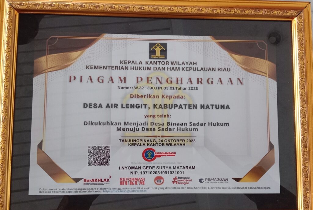 Dalam kesempatan yang sama Kepala kanwil Kemenkumham Kepri I Nyoman Gede Surya Mataram mengungkapkan, tujuan dikukuhkannya Desa binaan sadar hukum menuju Desa sadar hukum “Untuk menjadi Desa/kelurahan sadar hukum harus melalui beberapa tahapan,seperti pengisian qoesioner yang harus di isi oleh Desa/Kelurahan sehingga point, dan indikator Desa Sadar Hukum terpenuhi” Ujar I Nyoman Gede Surya Mataram.